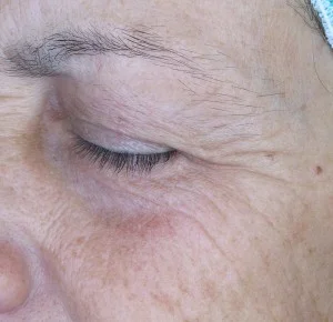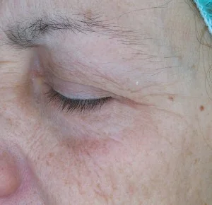 Slika: Prikazuje periorbitalno področje sodelujoče (stara 60 let), ki je 12 tednov uživala nizek odmerek koencima Q10 (50 mg). Prva slika prikazuje stanje pred dodajanjem, druga pa po 12 tednih rednega dodajanje.