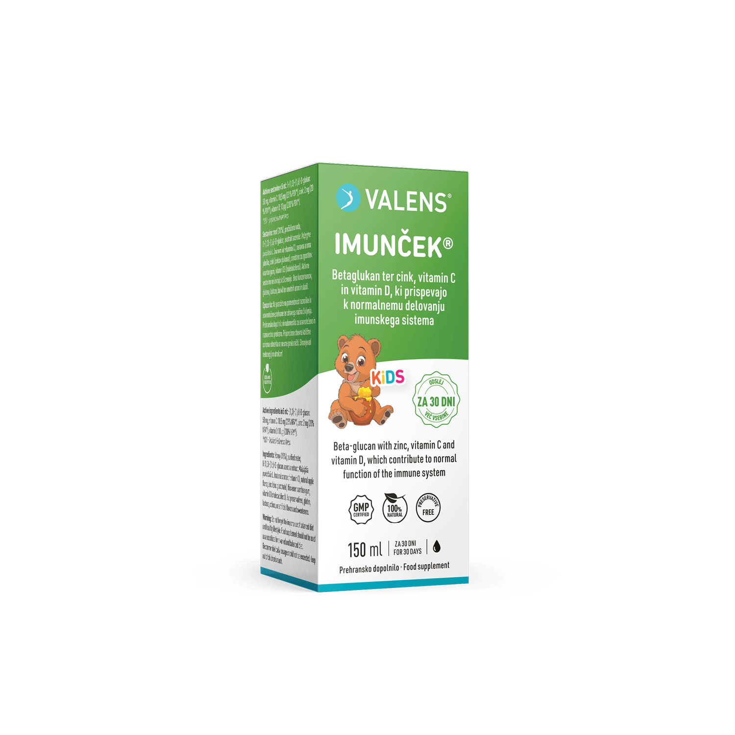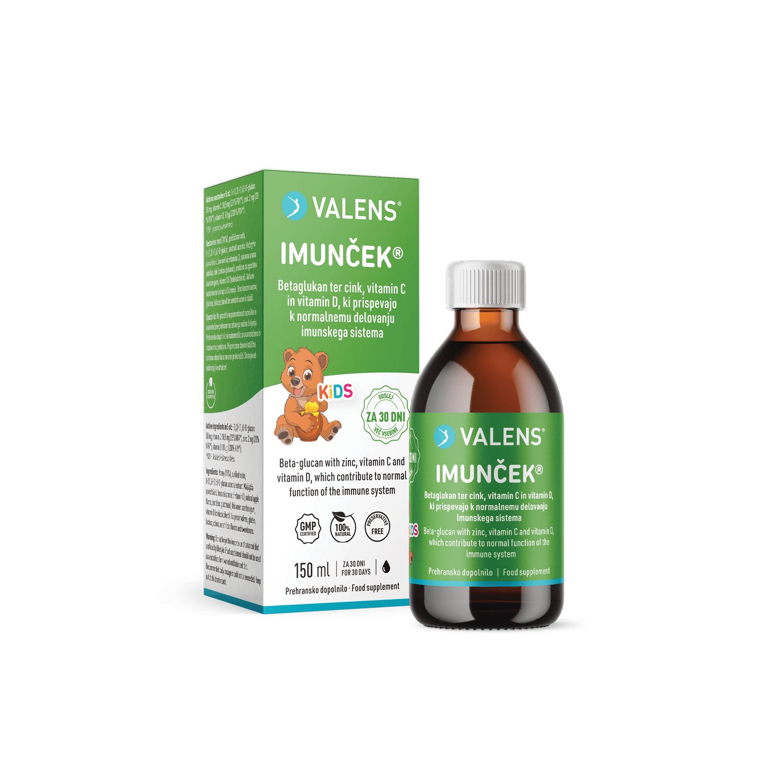 Imunček® je naravno prehransko dopolnilo za imunski sistem najmlajših članov družine. Ker vsebuje izključno naravne sestavine in je brez konzervansov, je sirup primeren že za otroke od 1. leta starosti. Vsebuje naravni betaglukan iz kvasa z dokazano povečano biološko aktivnostjo ter edinstveno kombinacijo vitaminov C, D in cinka iz naravnih virov. Imunček® je slajen izključno z medom in ima odličen okus jabolka, ki je otrokom še posebej všeč.