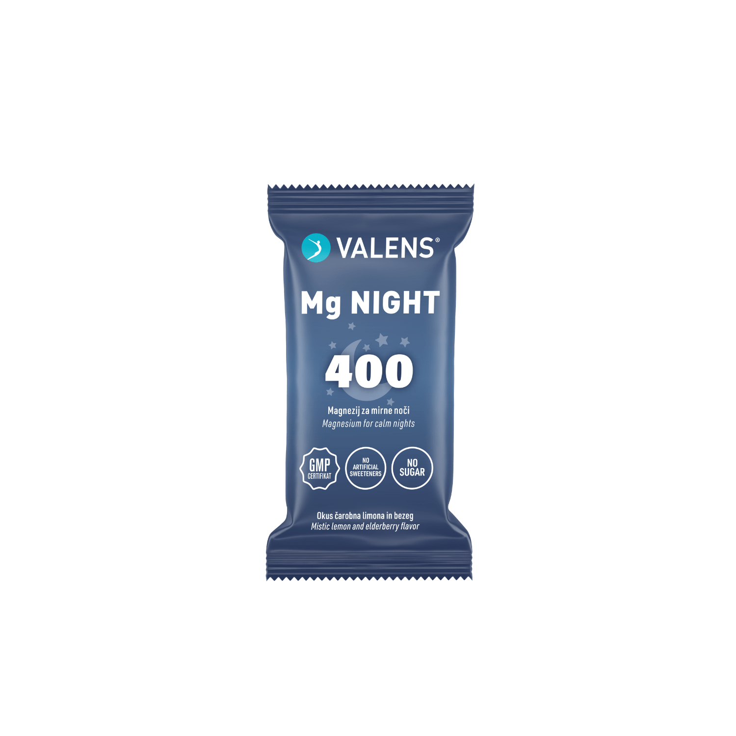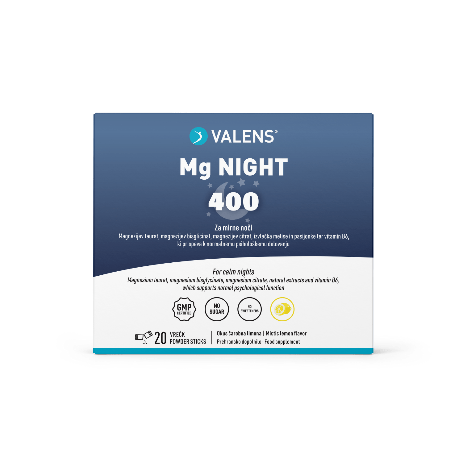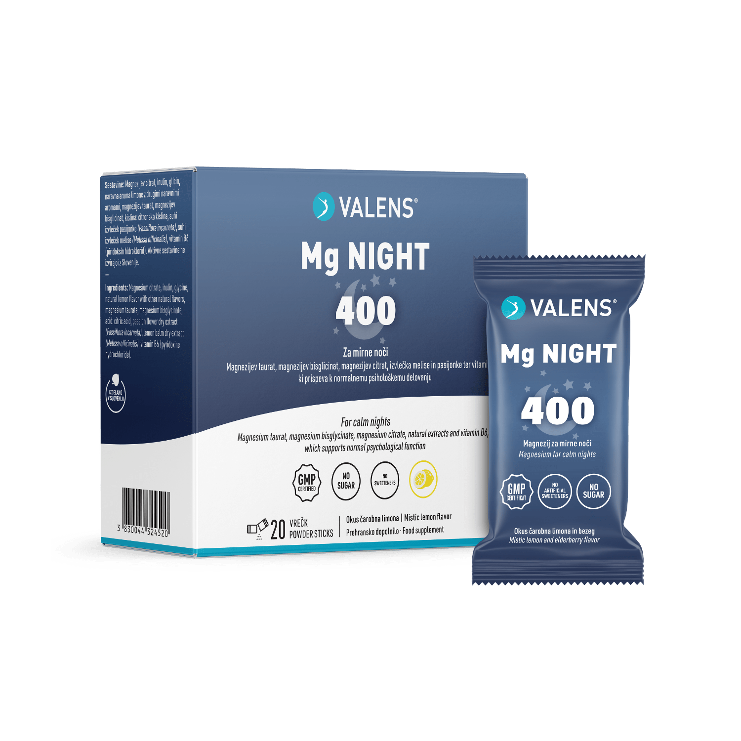Valens Mg Night je inovativno prehransko dopolnilo v obliki praška za pripravo okusnega napitka. Namenjeno je večerni podpori telesa in uma. Vsebuje magnezij in vitamin B6, ki prispevata k zmanjševanju utrujenosti in normalnemu psihološkemu delovanju, magnezij pa prispeva tudi k delovanju mišic. Izdelek je obogaten še z naravnima izvlečkoma melise in pasijonk, inulinom ter glicinom.