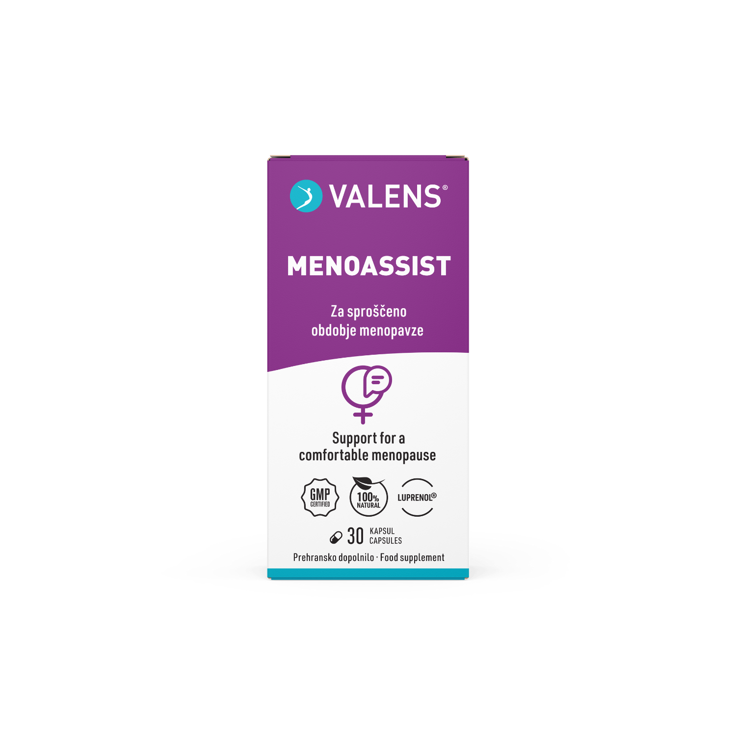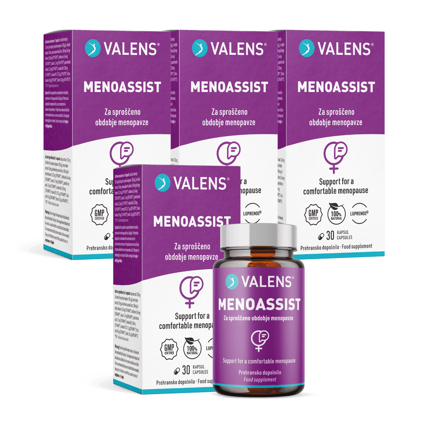 Valens MenoAssist je naravno prehransko dopolnilo v obliki kapsul, ki je namenjeno ženskam v obdobju menopavze. Vsebuje standardizirani naravni izvleček hmelja Luprenol®, ki dokazano pomaga pri pomirjanju in blaženju znakov menopavze. Hmelj je naravni vir fitoestrogena 8-PN z dokazano visoko aktivnostjo. Valens Menoassist vsebuje tudi Cultavit®, moko ajdovih kalčkov, ki je naravni vir celotnega spektra vitaminov skupine B. Vitamin B6 ima vlogo pri uravnavanju delovanja hormonov, niacin, riboflavin, pantotenska kislina, folna kislina ter vitamina B6 in B12 pa prispevajo k zmanjševanju utrujenosti in izčrpanosti. Biotin prispeva tudi k ohranjanju zdravih las in kože, kar je za ženske še posebej pomembno prav v obdobju menopavze. Izdelek vsebuje tudi izvleček melise, ki pomaga pri pomirjanju in izboljšanju spanca.