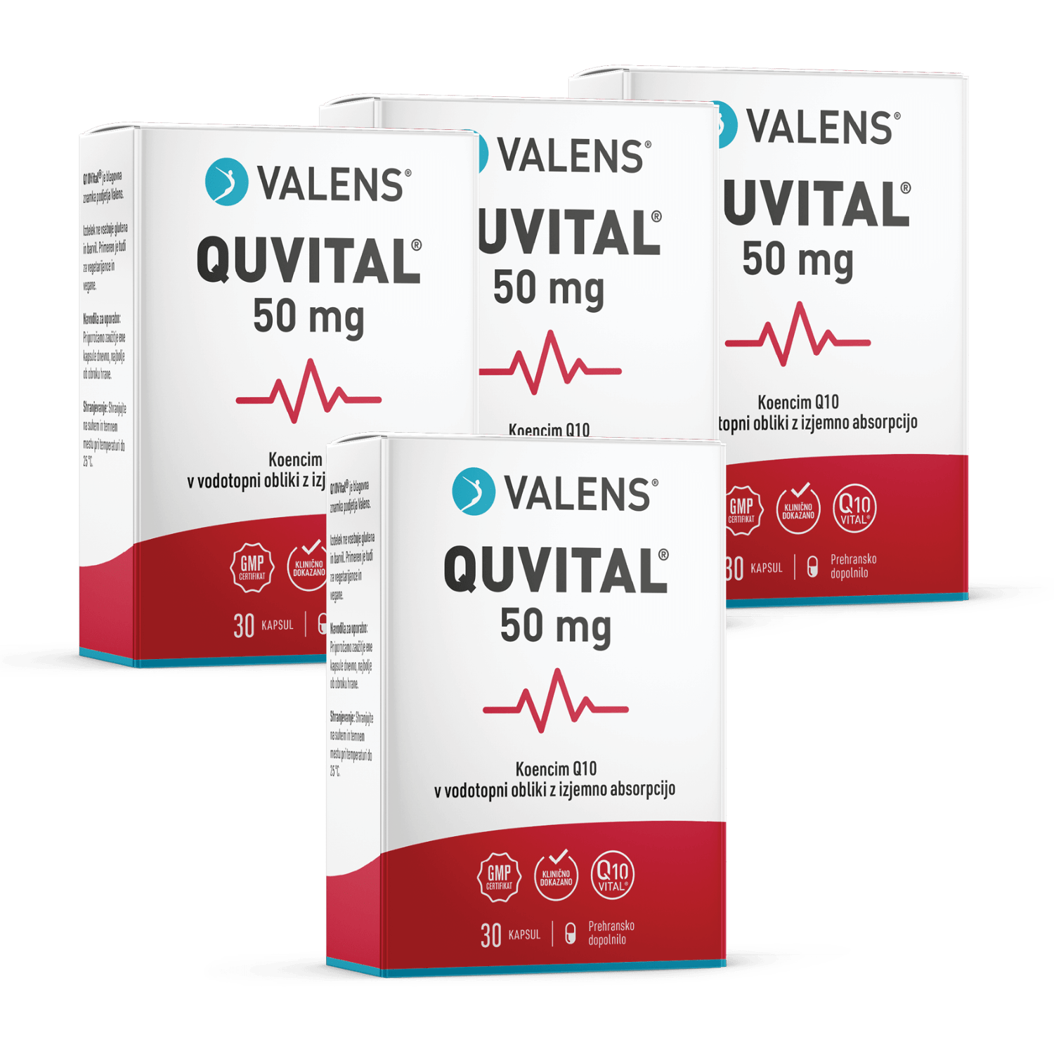 Edinstveno prehransko dopolnilo v obliki kapsul s koencimom Q10 z dokazano izboljšano biorazpoložljivostjo. Ena kapsula vsebuje 50 mg koencima Q10 naravega izvora v obliki Q10Vital®, ki je bila razvita in izdelana v Sloveniji. Gre za posebno aktivno vodotopno obliko, ki ima klinično dokazano izboljšano biorazpoložljivost od običajnih oblik. Quvital® kapsule vsebujejo še tiamin (vitamin B1) in riboflavin (vitamin B2).