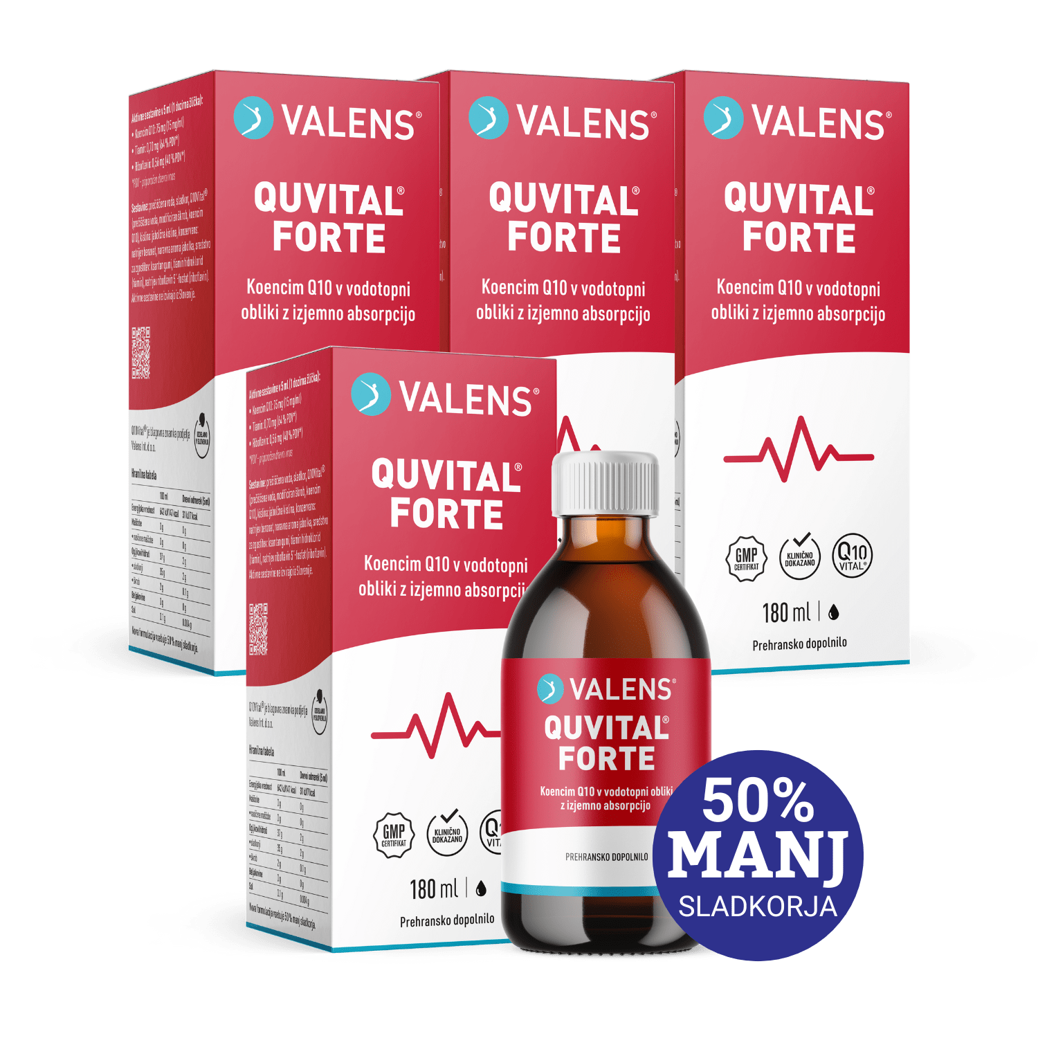 Edinstveno prehransko dopolnilo v obliki tekočine s koencimom Q10 z dokazano izboljšano biorazpoložljivostjo. Dnevni odmerek vsebuje 75 mg koencima Q10 v obliki Q10Vital®, ki je bila razvita in izdelana v Sloveniji. Gre za vodotopno obliko, ki ima klinično dokazano izboljšano biorazpoložljivost od običajnih oblik Q10. Tekočina predstavlja odlično alternativo kapsulam in tabletam, omogoča pa tudi, da odmerek razporedimo čez dan. Dokazano je namreč, da se koencim Q10 bolje absorbira, če ga zaužijemo v več manjših odmerkih. Quvital® Forte tekočina je obogatena še s tiaminom in riboflavinom in ima odličen okus jabolka.