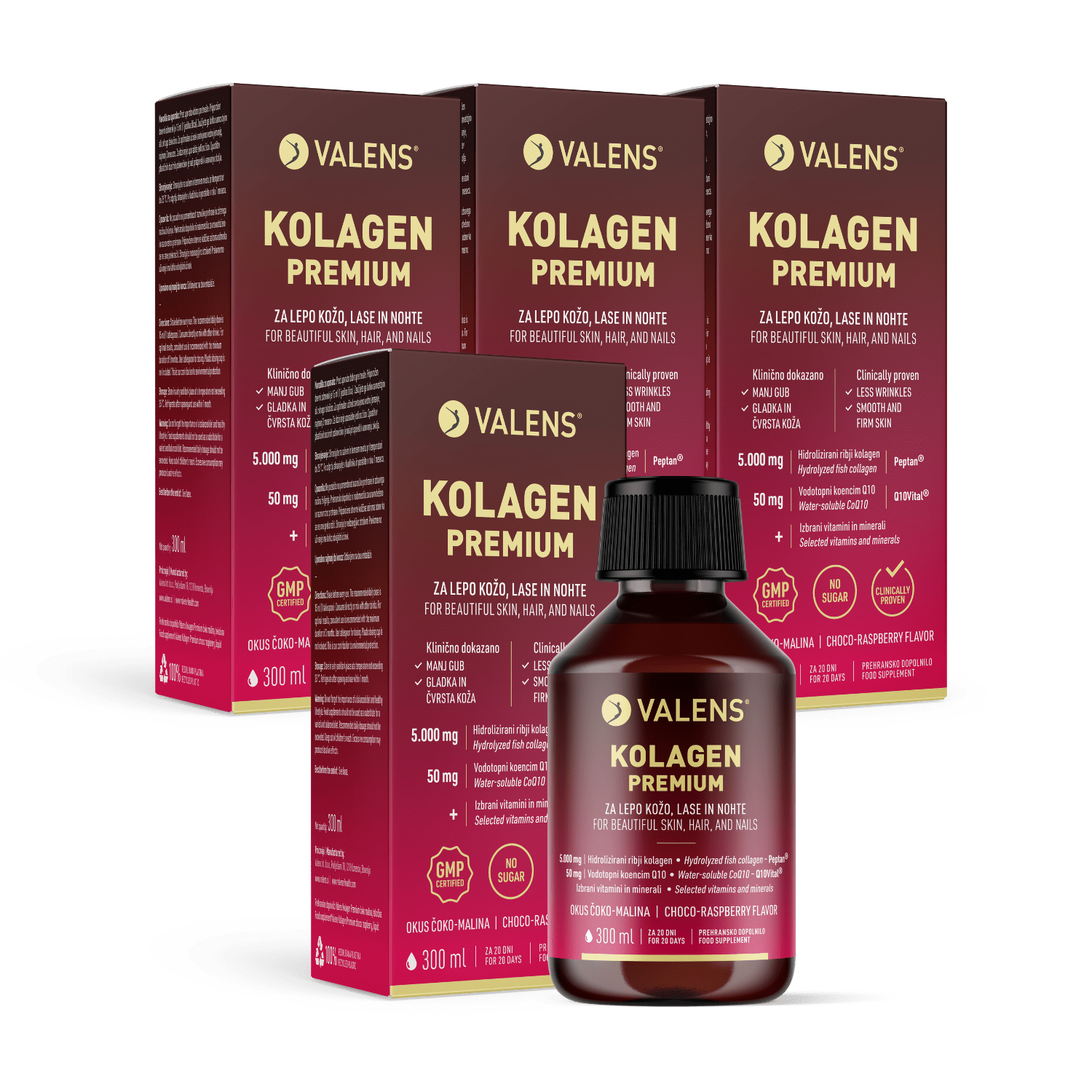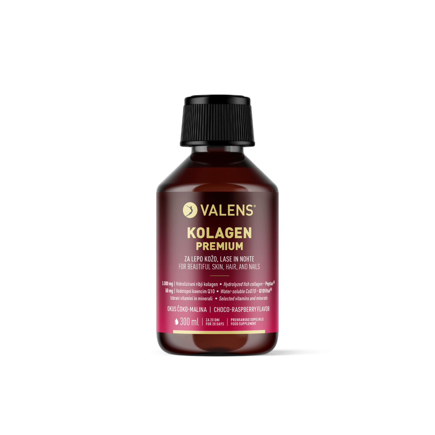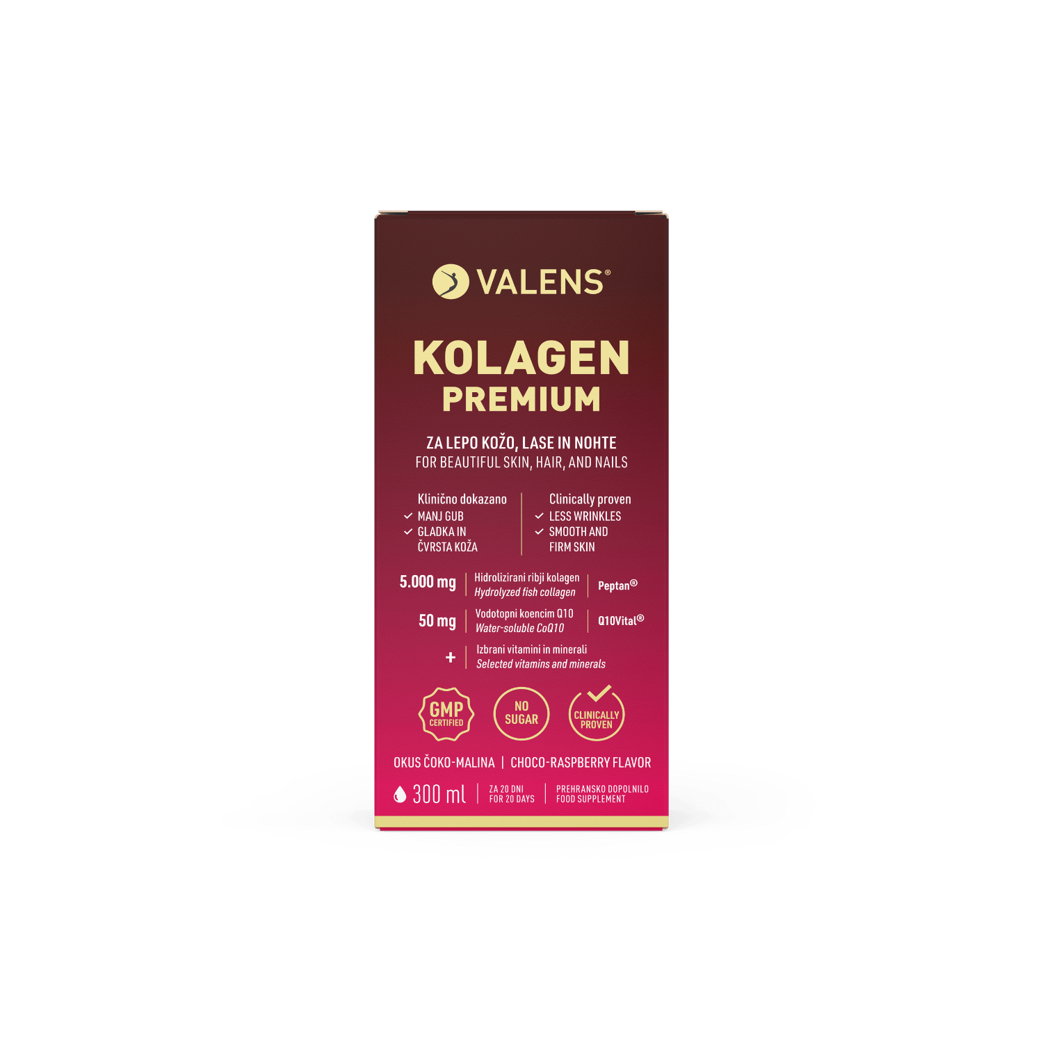Valens Kolagen Premium je edinstveno prehransko dopolnilo v obliki okusne tekočine, ki s svojo inovativno formulo podpira lepoto in zdravje od znotraj in skrbi za lepšo kožo, lase in nohte. Gre za prvi slovenski izdelek s kolagenom, katerega učinkovitost je bila dokazana z lastno klinično študijo. Revolucionarna študija je dokazala odlične sinergijske rezultate kolagena in koencima Q10, kar pomeni, da je njun učinek na koži večji, kot če bi obe učinkovini uživali posamično.