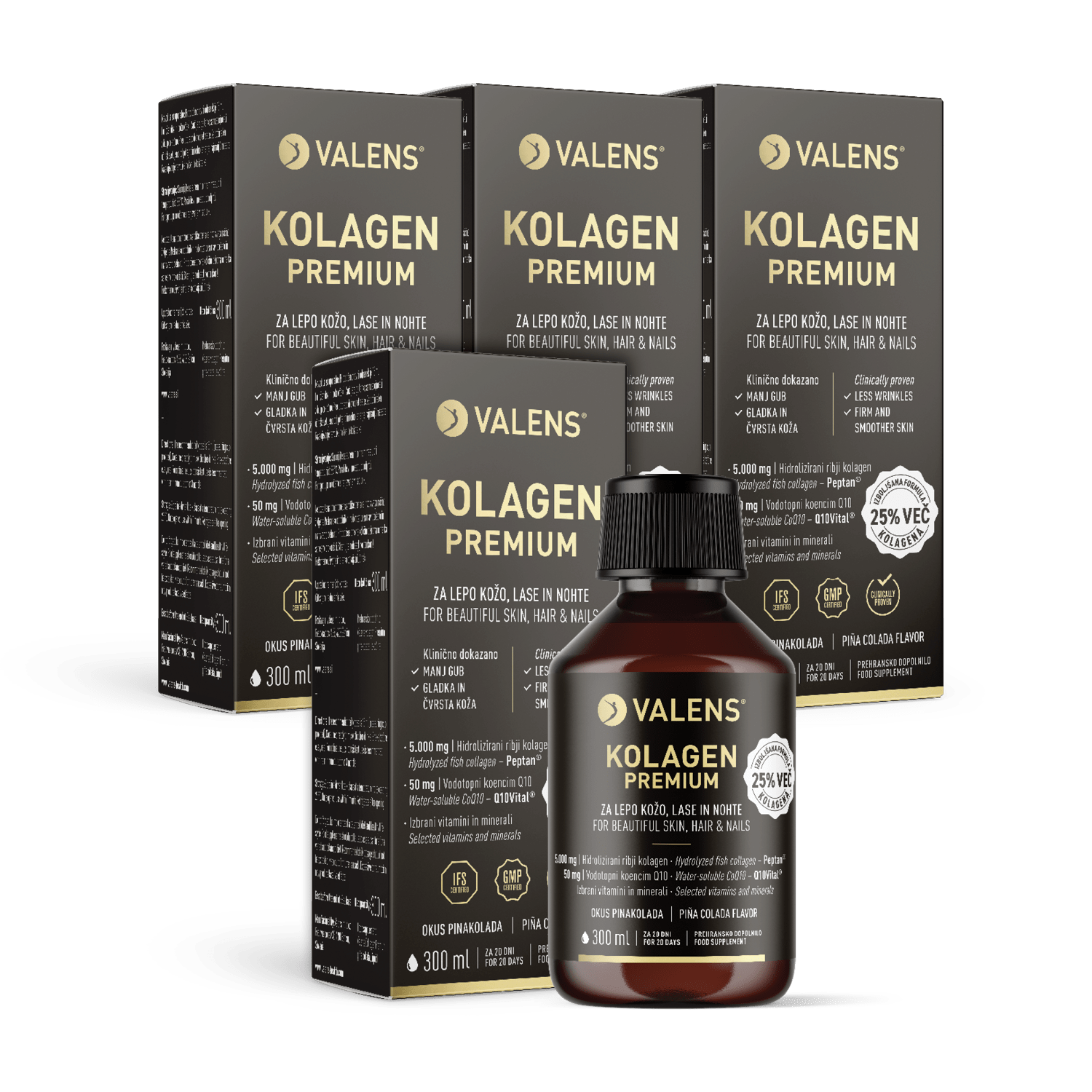 Valens Kolagen Premium je edinstveno prehransko dopolnilo v obliki okusne tekočine, ki s svojo inovativno formulo podpira lepoto in zdravje od znotraj in skrbi za lepšo kožo, lase in nohte. Gre za prvi slovenski izdelek s kolagenom, katerega učinkovitost je bila dokazana z lastno klinično študijo. Revolucionarna študija je dokazala odlične sinergijske rezultate kolagena in koencima Q10, kar pomeni, da je njun učinek na koži večji, kot če bi obe učinkovini uživali posamično. Izdelek ima odličen okus pinakolade in je brez dodanega sladkorja, slajen pa je s ksilitolom, ki se naravno nahaja v nekaterih vrstah sadja.