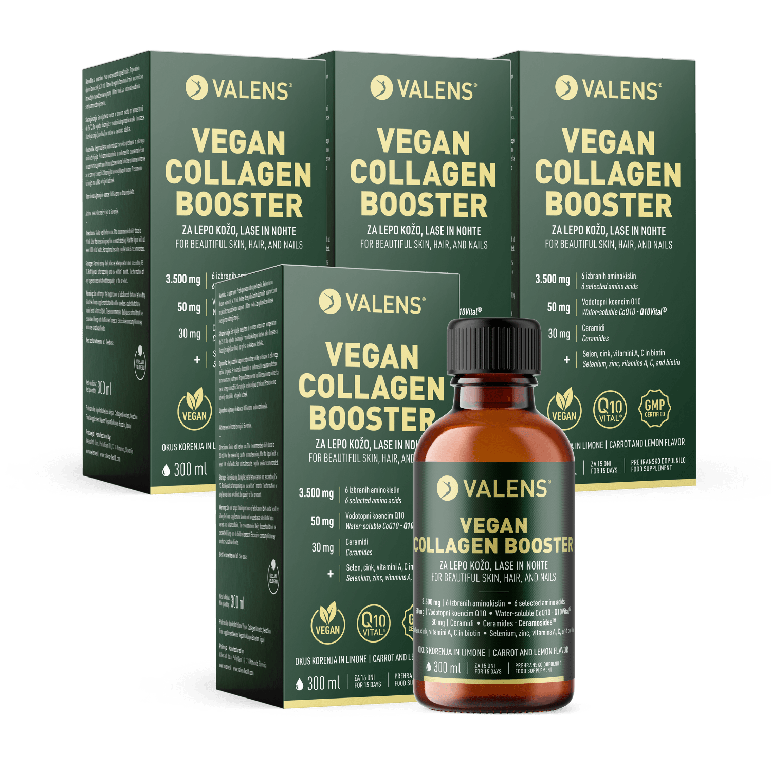 Kolagen je naravna snov, ki jo najdemo samo v ljudeh in živalih. Valens Kolagen Premium vsebuje morski kolagen, ki je pridobljen iz kože morskih rib in zato za vegane ni primeren. Za vegane primeren je le Valens Vegan Collagen Booster, ki vsebuje aminokisline (gradniki kolagena) rastlinskega izvora.
