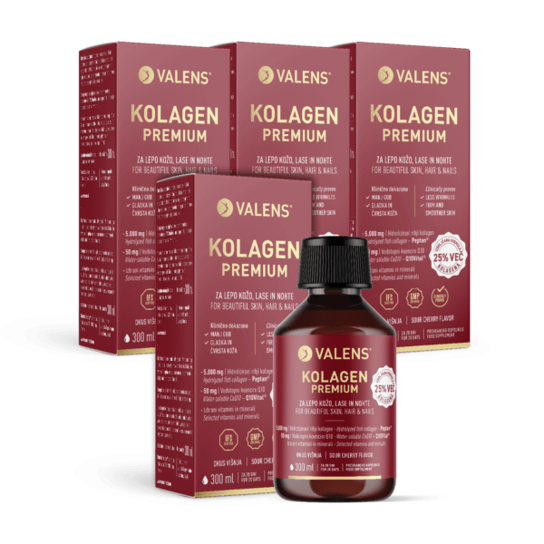 Valens Kolagen Premium je edinstveno prehransko dopolnilo v obliki okusne tekočine, ki s svojo inovativno formulo podpira lepoto in zdravje od znotraj in skrbi za lepšo kožo, lase in nohte. Gre za prvi slovenski izdelek s kolagenom, katerega učinkovitost je bila dokazana z lastno klinično študijo. Revolucionarna študija je dokazala odlične sinergijske rezultate kolagena in koencima Q10, kar pomeni, da je njun učinek na koži večji, kot če bi obe učinkovini uživali posamično. Izdelek ima odličen okus višnje in je brez dodanega sladkorja, slajen pa je s ksilitolom, ki se naravno nahaja v nekaterih vrstah sadja.