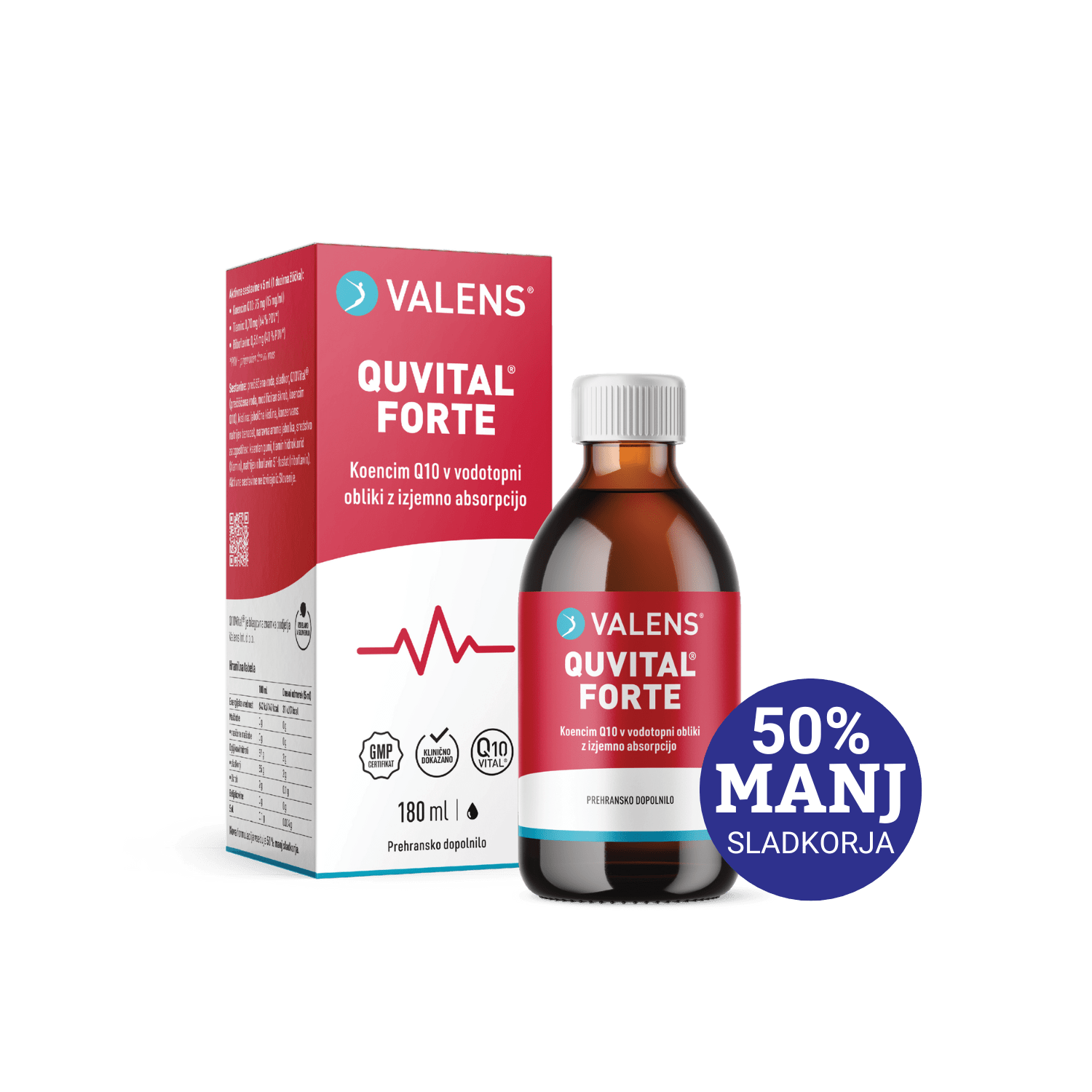 Edinstveno prehransko dopolnilo v obliki tekočine s koencimom Q10 z izboljšano biorazpoložljivostjo. Dnevni odmerek vsebuje 75 mg koencima Q10 v obliki Q10Vital®, ki je bila razvita in izdelana v Sloveniji. Gre za vodotopno obliko, ki ima klinično dokazano izboljšano biorazpoložljivost. Tekočina predstavlja odlično alternativo kapsulam in tabletam, omogoča pa tudi, da odmerek razporedimo čez dan. Dokazano je namreč, da se koencim Q10 bolje absorbira, če ga zaužijemo v več manjših odmerkih. Quvital® Forte tekočina je obogatena še s tiaminom in riboflavinom in ima odličen okus jabolka.
