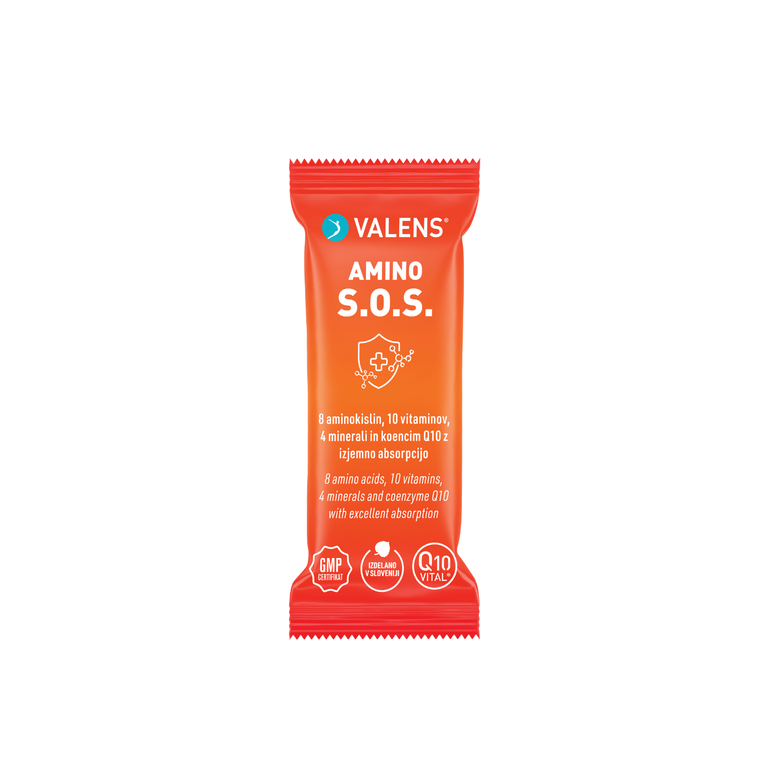 Valens Amino S.O.S. je inovativno prehransko dopolnilo, namenjeno podpori imunskega sistema. Bogata formula združuje kar 8 aminokislin, 10 vitaminov in 4 minerale. Izdelek je obogaten še s Q10Vital®, vodotopno obliko koencima Q10 z izboljšano absorpcijo.