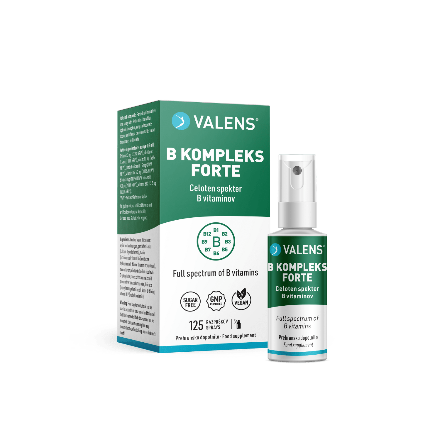 Inovativno prehransko dopolnilo v obliki okusnega ustnega pršila. Izdelek vsebuje visoke koncentracije vseh 8 vitaminov skupine B, ki jih naše telo potrebuje za normalno delovanje. Oblika ustnega pršila omogoča enostavno odmerjanje in odlično absorpcijo, ki se prične že v ustni votlini. Valens B kompleks Forte predstavlja tudi odlično alternativo za tiste, ki ne morejo ali ne želijo uživati kapsul oziroma tablet.