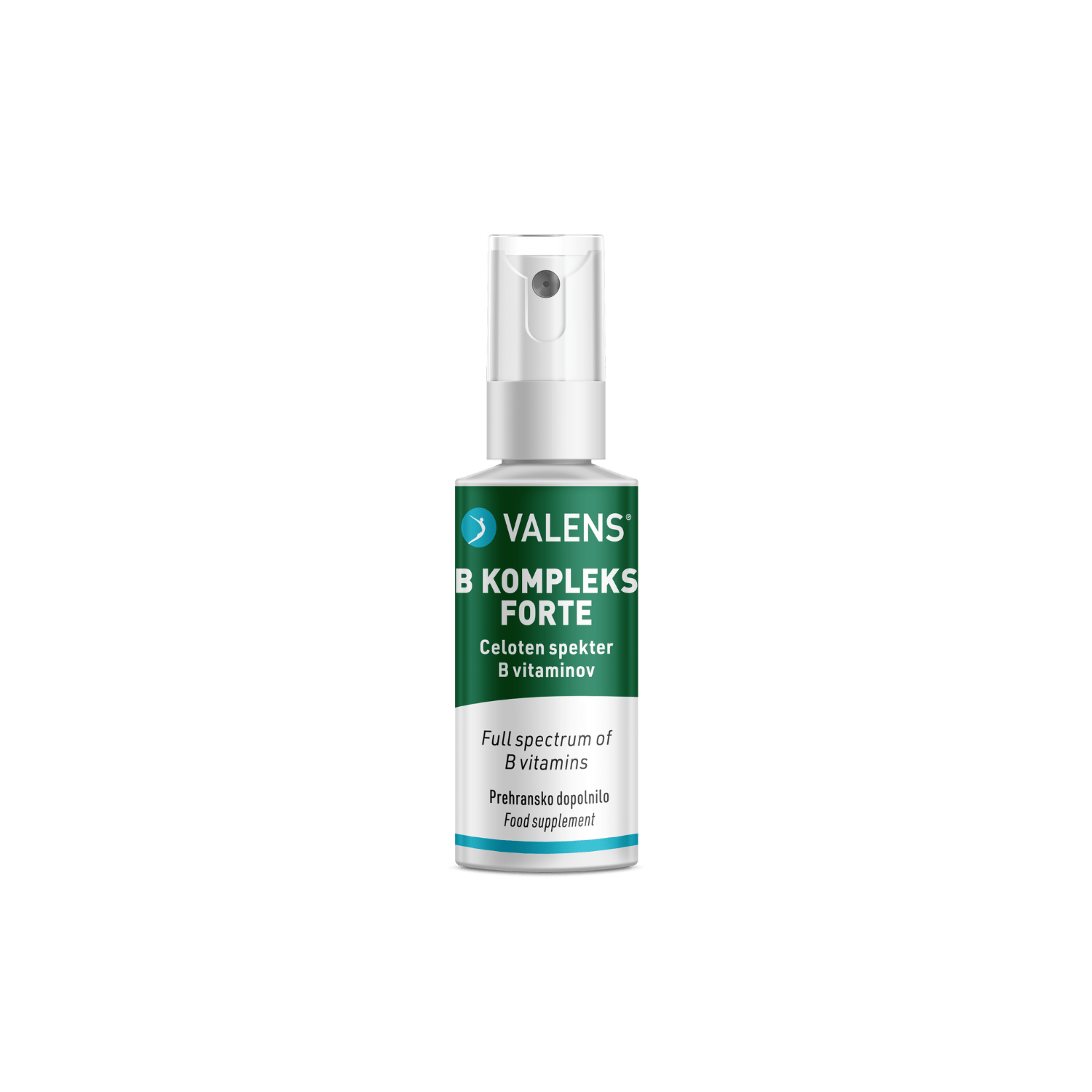 Valens B kompleks Forte je inovativno prehransko dopolnilo v obliki okusnega ustnega pršila. Vsebuje visoko koncentracijo vseh 8 vitaminov skupine B, ki jih naše telo potrebuje za normalno delovanje. Oblika ustnega pršila omogoča odlično absorpcijo, ki se začne že v membranah ustne votline. Izdelek je še posebej priročen za vse, ki imajo težave z absorpcijo v prebavilih, predstavlja pa tudi okusno alternativo kapsulam in tabletam. Valens B kompleks forte ne vsebuje sladkorja, izbrane naravne arome pa poskrbijo za prijeten okus.