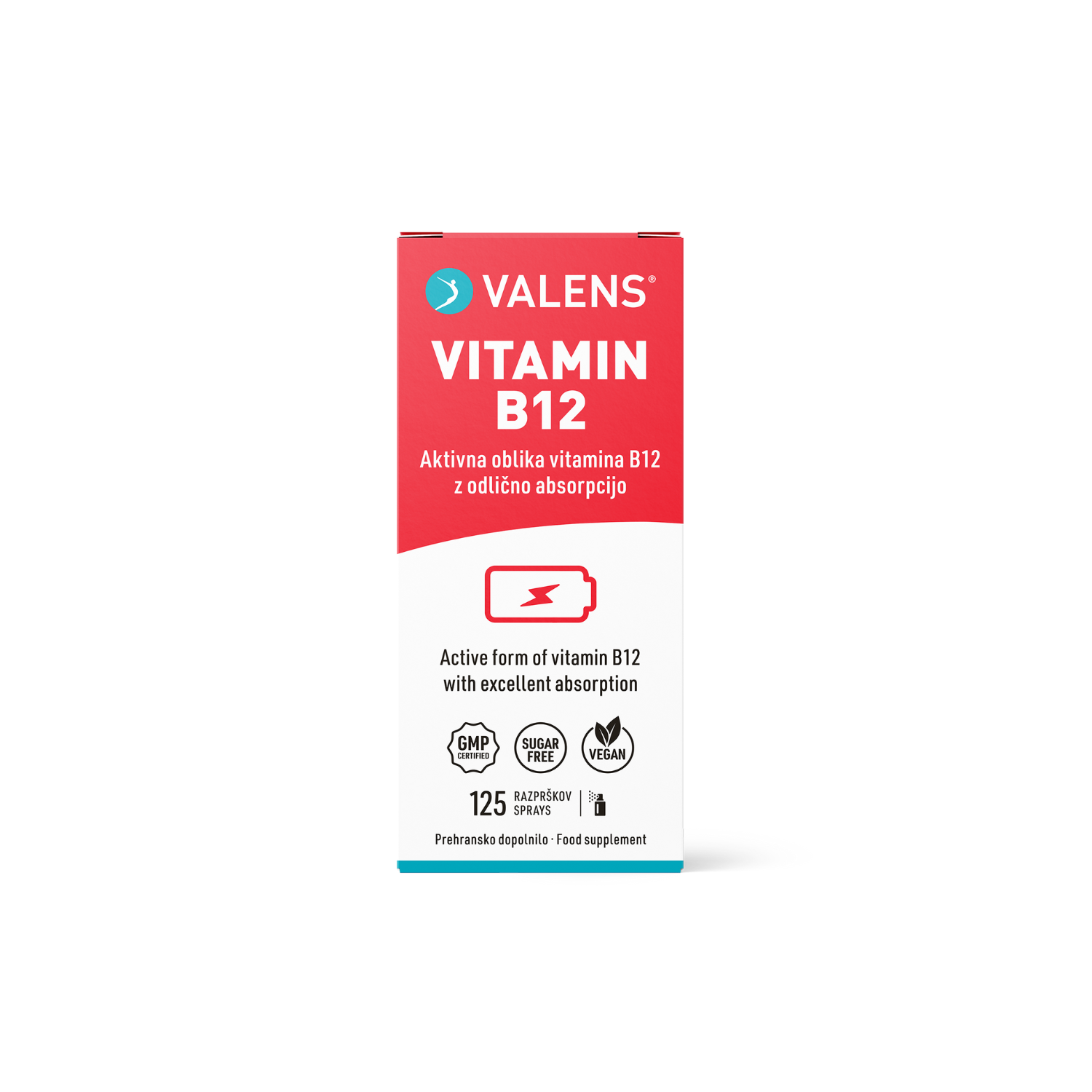 Valens B12 je inovativno prehransko dopolnilo v obliki ustnega pršila z odličnim okusom češnje. Vsebuje metilkobalamin, aktivno obliko vitamina B12 naravnega izvora. Oblika pršila omogoča hitrejšo in boljšo absorpcijo, ki se začne že v membranah ustne votline. Izdelek je še posebej priročen za vse, ki imajo težave z absorpcijo v prebavilih, predstavlja pa tudi okusno alternativo kapsulam in tabletam. Vitamin B12 prispeva k: