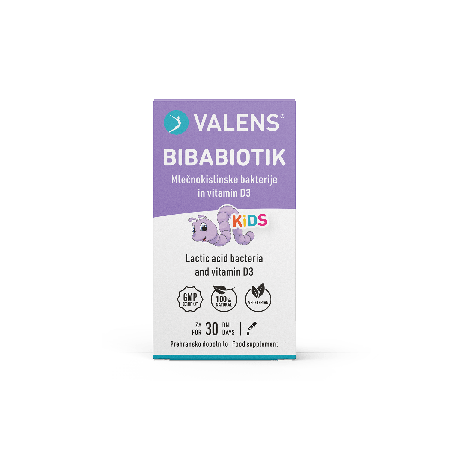 Valens BibaBiotik je prehransko dopolnilo v obliki kapljic za dojenčke in mlajše otroke. Vsebuje izključno sestavine iz naravnih virov in je brez konzervansov. Kapljice vsebujejo dva specifična, oštevilčena seva mlečnokislinskih bakterij Lactobacillus rhamnosus ter Lactobacillus reuteri. katerih kombinacija je izbrana na podlagi znanstvenih raziskavFormula vključuje tudi: