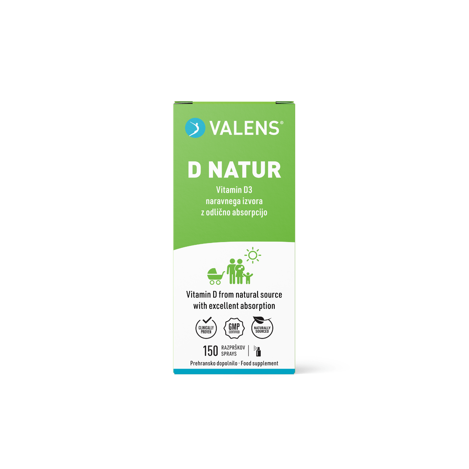 Valens D Natur je prehransko dopolnilo v obliki ustnega pršila, ki je bilo ustvarjeno posebej za dojenčke. Inovativna oblika z izjemno nežnim razprškom omogoča hitro, enostavno in zanesljivo doziranje, brez štetja nerodnih kapljic ali odmerjanja na žličko. Izdelek v enem odmerku vsebuje 400 IU vitamina D (holekalciferol), primeren pa je tudi za otroke in odrasle, ki želijo uživati bolj naravna dopolnila.