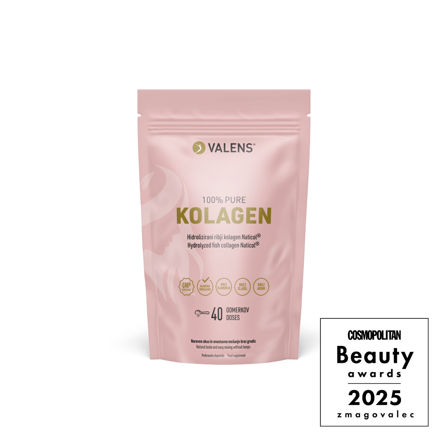 Kolagen je v telesu najbolj pogosta beljakovina, ki je prisotna v koži in vezivnem tkivu. Naše telo ga proizvaja samo, vendar začne “notranja proizvodnja” po 20. letu upadati – sprva malo manj opazno, z leti pa vedno hitreje, po 40. letu že kar za 1 % na leto. Upadanje ravni kolagena v telesu se navzven kaže predvsem na koži. Nekaj kolagena lahko v telo vnesemo z uživanjem živalske kože, vezi ali kosti, lahko pa ga uživamo v obliki kakovostnih prehranskih dopolnil, kot je Valens Kolagen, ki vsebuje dovolj visoke količine hidroliziranega kolagena.