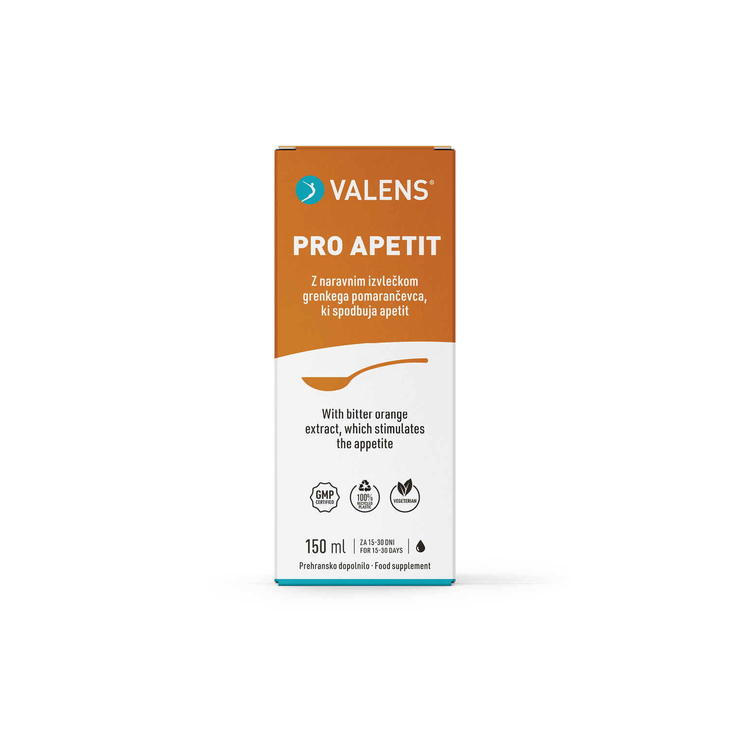 Valens Pro Apetit je inovativno prehransko dopolnilo za apetit oz. spodbujanje teka pri neješčih ljudeh. Zaradi skrbno izbranih sestavin je primerno za vse generacije in je namenjeno tako otrokom od 3. leta starosti kot odraslim, ki imajo pomanjkanje teka in posledično nezadosten vnos hranil. Valens Pro Apetit je slajen izključno z medom in ima odličen okus češnje. Vsebuje: