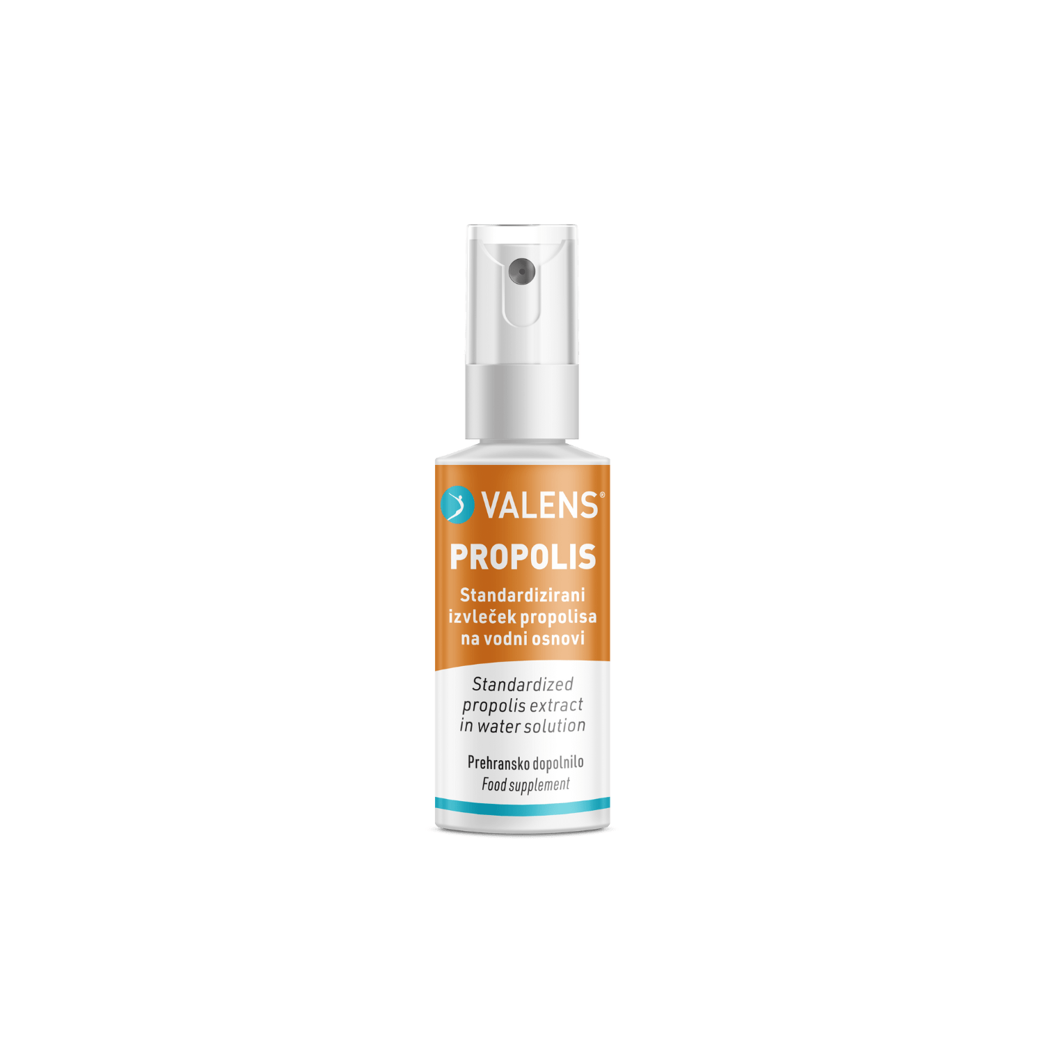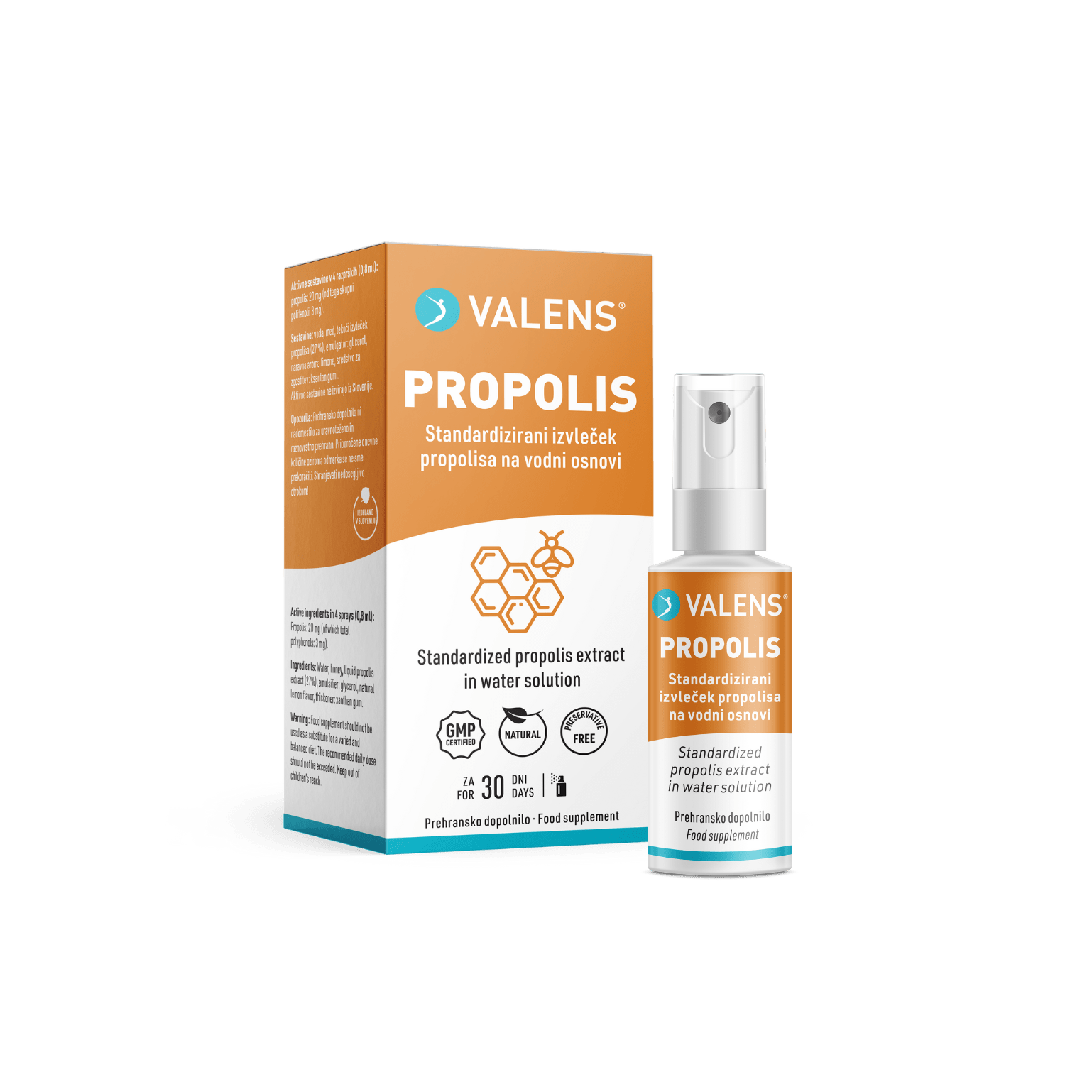 Valens Propolis je naravno prehransko dopolnilo v obliki ustnega pršila s standardiziranim izvlečkom čebeljega propolisa, ki zagotavlja stalno vsebnost bioflavonoidov. Inovativna formula na vodni osnovi ne vsebuje alkohola in konzervansov, zato je izdelek primeren tudi za otroke od dopolnjenega 3. leta starosti. Za razliko od običajnih izdelkov s propolisom ima Valens Propolis izjemno prijeten okus, ki smo ga ustvarili s kombinacijo medu in naravne arome limone.