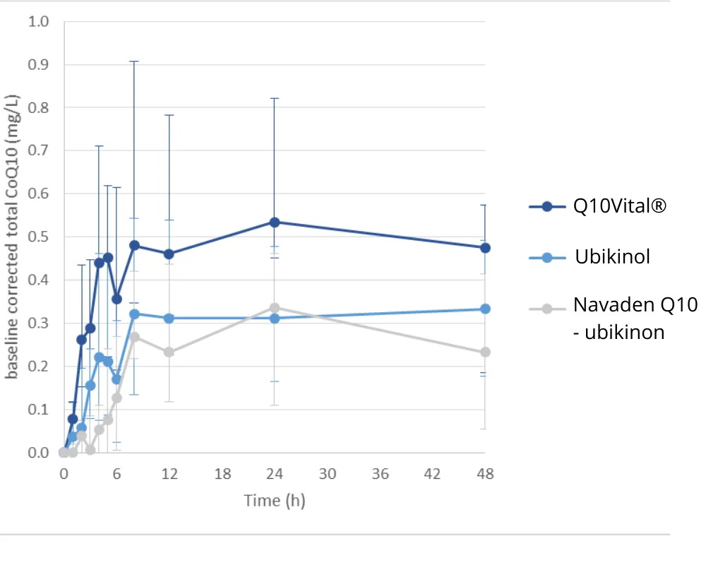 2. Absorpcija je boljša tudi v primerjavi z ubikinolnimi kapsulami – v primerjavi z ubikinolnimi kapsulami z izboljšano absorpcijo je bila biorazpoložljivost oblike Q10Vital® 1,5-krat boljša, vendar razlika ni dosegla statistične značilnosti.
